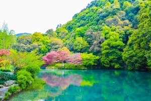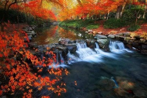 弯弯曲曲的小路一直通往茶香四溢的龙井村,一路上叮叮咚咚泉。离九溪公交站的不远处便是一片红枫林拥着一条小溪。