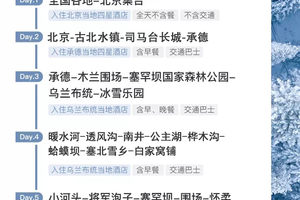 注:实际线路、时间,可能会根据路况以及天气情况等作出合理调整,领队有权重新调整安排,首都国际机场建议买19:30以后的航班,大兴国际机场建议买21:00以后的航班,火车返程建议购买19:30以后的,或者购买第二天返程机票或火车票。
