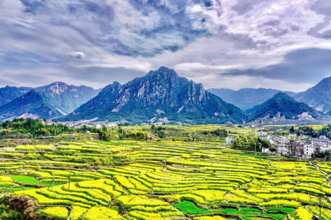 三四月安徽家朋梯田菜花,隐秘开放。在古村落和群峰环峙之下,构成了一座“藏起来的花海梯田”,极为壮观。这壮观的油菜花田夹杂小麦梯田,一层黄一层青,“双色花海”错落有致,在此疯狂拍照留影吧!