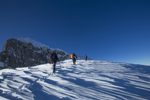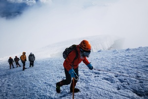08:00 抵达海拔4900雪线,简单休整、喝热水,换上冰爪及攀登技术装备;进入冰雪混合地带,这是最艰难的雪坡,冲刺到5000米后经过月亮湾,胜利就在眼前;从这里开始领略雪山的魅力,只有眼睛在天堂!