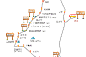 1.交通:成都往返根据人数选择合适车型,一人一座。(其中:①康定老榆林村—水电站中转车;②玉龙西村公路边—玉龙西村中转车;③玉龙西村—冷嘎措山脚往返中转车;④玉龙西村—子梅垭口—子梅村中转车。)