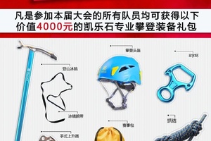 国内唯一高海拔速攀赛比赛山峰; 凡是参加本届大会的所有队员均可获得以下价值4000元的凯乐石专业攀登装备礼包; 攀登难度高于四姑娘山三峰,属冰川型山峰,终年积雪。拥有陡坡、裂缝、冰斗等地型丰富的冰川!
