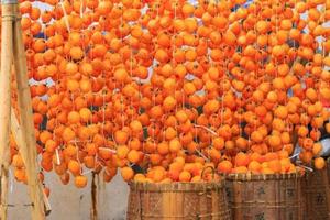 晒柿子是当地一大特色,这里的人们家家户户都要晒柿子, 户户做柿饼,一串串挂满柿子的晾架,就成为秋日里最美的风景。成百上千的柿子一帘帘垂下来,如同一道道红色的瀑布,通体鲜红透亮,光艳夺目,在秋日的映照下,金碧辉煌,“飞流直下三千尺,疑是红河落九天”,让人大开眼界、目眩神迷,是秋日里最美的晒秋美景。