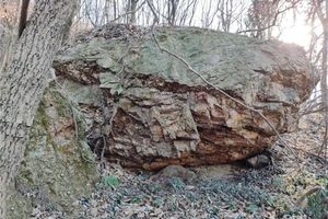 马山,海拔362米,九龙山自然风景区第二高山,以山形似马状,故名。半山腰间,静卧着一块巨石,高约7米,宽,10米,形如巨卵,是大自然赐予这片古老而神秘土地的一份礼物。传说一个住在马山顶修炼的马精,因触犯天条,祸害民间,遭到天打五雷轰,被击后跌落至山坡,变成了一块石。