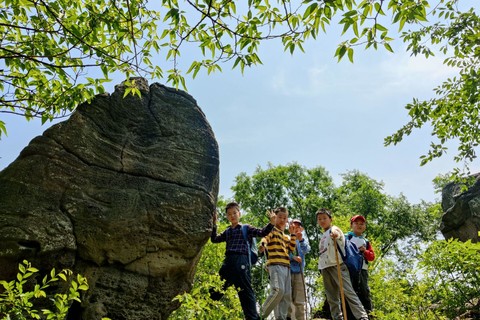 下到浦口烈士纪念碑,缅怀革命先烈,少年儿童们热血沸腾,继续登顶石婆峰。石婆峰下山略陡,是全程最难的一段,小朋友们用领队讲的正确姿势安全下山。下山后经郭子仪街、乌龟驮经处抵达南京小九寨沟—老母猪沟,在此打卡,小朋友们可以在岸边玩玩水,但是不要下水哦,玩尽兴后适时返程,下次再约已是有户外经验的少年!