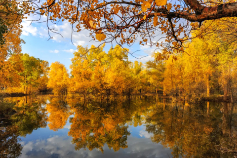 适时离开,前往【金塔胡杨林】,前面已经看了两天的胡杨林,是不是有些视觉疲劳?其实,我们贴心安排这里,是担心气候原因,胡杨的叶子变黄时间无法掌控,多一处胡杨林就多一次机会。再者,金塔胡杨林树龄不长,游人也较少,水中倒影更富情趣,是美美凹造型的好地方。