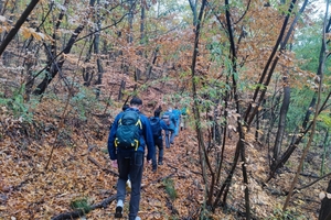 后延水渠下山,走防火道到黄龙堰水库,继续沿防火道前行,抵达猪咀凹脚下,根据队员状态及天气情况选择是否丛林穿越,部分路段无路迹,有树枝有刺,也可继续沿防火道绕过猪咀凹。