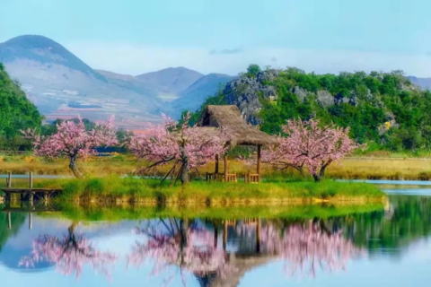 早餐后我们前往2017年热播剧《三生三世十里桃花》的实景拍摄地菜花箐村看最美的‘小桂林’景致,三生缘起,静待花期;灼灼桃夭、十里芳华。漫山遍野的“桃花”仙境,这便是上神折颜的避世之处。小桥,孤峰,桃花岛…在湖水的倒映下美得特别不真实,恍若人间仙境,置身其中仿佛人在画中游。