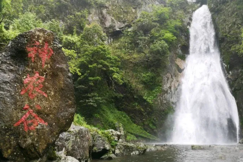 途中九叠瀑布在悬岩绝壁,呈“一线天”之势,溪水从悬岩绝壁十余丈里,骤然落下,年长日久的冲刷,紧挨山崖处便形成了九大碛石。从上往下数,一共有九层,一层叠着一层,层层相扣,水珠相连,每一层形成一个天然的珠帘门,蔚为壮观。