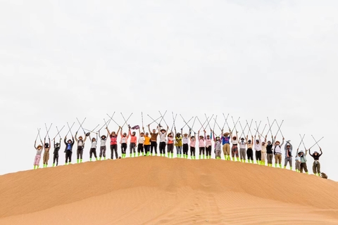 午餐之后,预计13:30左右抵达徒步起点,分发沙套、魔术头巾、登山杖等物资,之后跟随领队在沙漠徒步起点处开始做热身运动,今日徒步全天行程8公里,匀速5-6小时即可到达营地,夜宿小天鹅湖营地。