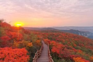 站在天桥岭极目远眺,遍山黄栌红烂漫,你会感叹此景只应天上有, 人在画中走,兀自怀疑在人间。远峰近崖,自低而高,黄栌叶由姜黄、姜红、鲜红渐次变为桃红、乌红,色彩层次分明,似红云浮动,巍巍壮观。