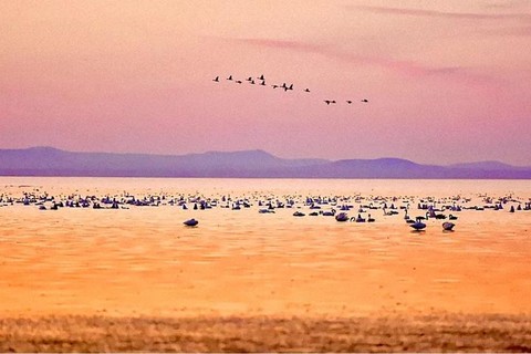 行驶至【达里湖】湖边,正值日落时分,高大的风车伴着太阳的光辉不停地旋转,夕阳余晖洒在草原湖泊上,水天一色,缤纷绚烂。相信在达里湖观赏到的日落一定会让你不虚此行,让你忘记疲惫烦恼,静静地看着天色变红、变暗。此时正是拍摄剪影的好时机,大家可以多拍些照片,留下我们此行的美好记忆。