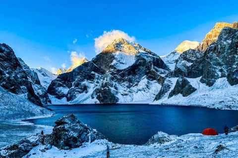早晨起床后修整,清晨的天堂湖静谧而灿烂,第一缕阳光映射在峰顶,在巍蔚壮蓝的湖水映衬下犹如仙界;中午出发,沿阿克布拉克河谷开始下行,这里是深山牧场,零星牛羊点缀在河谷中。途中需要过河7-8次,一路不断下降。下午抵达阔克苏河营地后扎营。