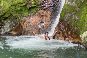 早餐后出发前往螺蛳湾,竹桥合影后下水,随着溪流向上游进发,沿途水潭会游泳的游泳,不会游泳的浅水区戏水,一路走走停停打水仗。不知不觉便来到了最为壮观的龙门瀑布,其景观独特,魅力无限,堪称天下一绝,一道石门自天而降,耸立于飞瀑之上,潺潺溪流穿门而过,汇入飞瀑凌空,置身瀑下,如临仙境。瀑下水潭,是游人嬉戏拍照的最佳场地。