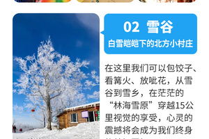 早起,迎着初升的太阳出发去【雪乡】吧!徒步全程需要5-7小时(长度为15公里,徒步起点海拔400米,海拔最高点1235米,虽然基本为缓坡上行和下行,但是对体力有一定要求,同时需要应对严寒的挑战,但是身体健康的队员都能适应和克服,并能顺利享受全程的美丽风景。下坡过程中尤其要注意防滑),这是一场深入林场、雪山中的大冒险,我们将穿越白雪覆盖的森林,登顶【羊草山】,来到雪乡。雪乡的商业开发很严重,但是并不影响这里的美丽。你可以自行参加这里丰富的户外活动(包括滑雪、雪圈、雪地摩托等等),充分感受雪的魅力。