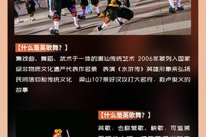 英歌舞取材于中国四大名著中的《水浒传》,舞蹈角色都来自《水浒传》中的一百零八将英雄好汉。其主要表演形式为大型集体舞,舞者双手各持一根短木棒,上下左右互相对击,动作刚健有力,节奏强烈,以刚劲、雄浑、粗犷、奔放的舞姿,构成了磅礴、威武、强壮、豪迈的气势,给人以力与美的震撼,舞后还有歌舞小戏,称“英歌后棚”,其常于民俗节庆、游神赛会活动中表演,是第一批列入国家级非物质文化遗产名录的民间舞蹈项目。