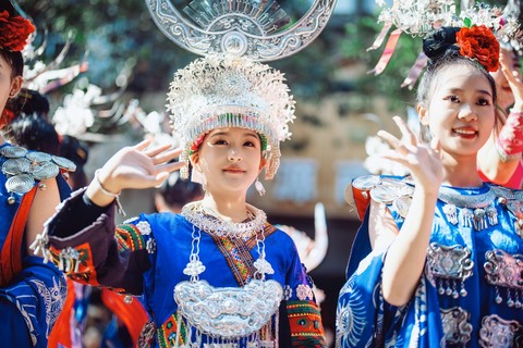 早餐后乘车前往台江县城,观看姊妹节盛装巡游,跟随盛装巡游队伍,一路摄影创作,欣赏不同盛装服饰、银饰,与苗家阿哥阿妹们载歌载舞,享受一场沉溺式视觉盛宴。