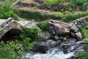 这里是峡谷中的一片小盆地,周围山峰绵延,海拔高达上千米,一条清澈的小溪从远处山谷中流淌过来,蜿蜒穿过村落,四季不停地流淌着泉水。水滚石大大小小挤在河谷中,局部河床裸露出黑色硅质基岩,溪流中不时可以看到小鱼小蟹在水中嬉戏。