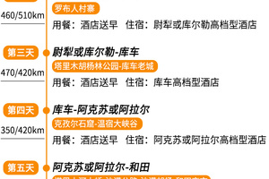 3、门票:白沙湖、喀拉库勒湖因沿途就可以看到,司机会给大家时间拍照,如需进入景区,请自行购买门票;沙漠公路、盘龙古道、班迪尔蓝湖、塔合曼湿地暂未收取门票费用,如产生费用请各位队员自理。