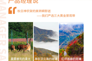 3. 本产品属于秋季产品,秋景确定时间不确定的,正常是10月份秋景,但是也有提前或延后情况,游玩时请合理对待实际景色;