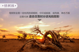适时离开,享用午餐。午后抵达【黑水城】,这是丝绸之路北线现存最完整、规模最大的一座古城遗址。夕阳下,5座佛塔在沙漠中蔚然挺立,依稀可以感觉到当初这里的强盛,离黑城遗址不远,便是【怪树林】。 这里是一些枯死的胡杨树,它们或挺拔,或佝偻,神态万般。这里尤其适合日落时分逆光拍剪影,那种无以言说的悲壮,震撼着观看者的心灵。