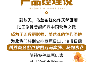 早餐后,换乘越野车,开启刺激的【越野车穿越】之旅,一路游览乌兰布统欧式草原美景!我们乘坐越野车,进入林地深处,车轮碾过蜿蜒小径,闯入秋日秘境,金黄草甸在风中翻涌,碧蓝湖水边牛羊似珍珠散落。深入林地,豁然出现一片金色草场,四周静谧无人,唯有秋阳将鎏金般的光瀑倾洒而下,为每一株草叶都镀上暖融融的光晕。目之所及,金黄草甸与湛蓝苍穹无缝相接,随手按下快门,都是流转着暖意的秋日油画。