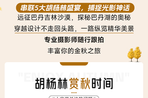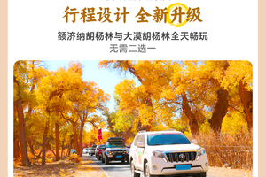 拍摄结束后,我们前往【额济纳胡杨林】自由畅玩,额济纳有很多适合拍摄人像的地方,我们将安排驻地摄影师旅拍,定格你与额济纳胡杨林的独家记忆。你可以先在额济纳胡杨林ZUI美场景——【二道桥倒影林】看金色胡杨与黑水河交融的梦幻倒映,接着在【四道桥英雄林】领略张艺谋的《英雄》中张曼玉和章子怡一战成名的经典。随后来到八道桥附近的中国DI三沙漠【巴丹吉林沙漠】来个与沙漠的亲密接触(狂野沙漠娱乐活动(费用需自理):纵享心跳的沙漠越野车、任你穿行的卡丁车、感受沙漠壮美的骆驼骑行、惊险刺激的滑沙)。如需前往【大漠胡杨林】景区,额济纳旗胡杨林游玩结束后可自行前往,刷身份证进入大漠胡杨林景区,景交车30元/人需自理,游玩结束后返回酒店!