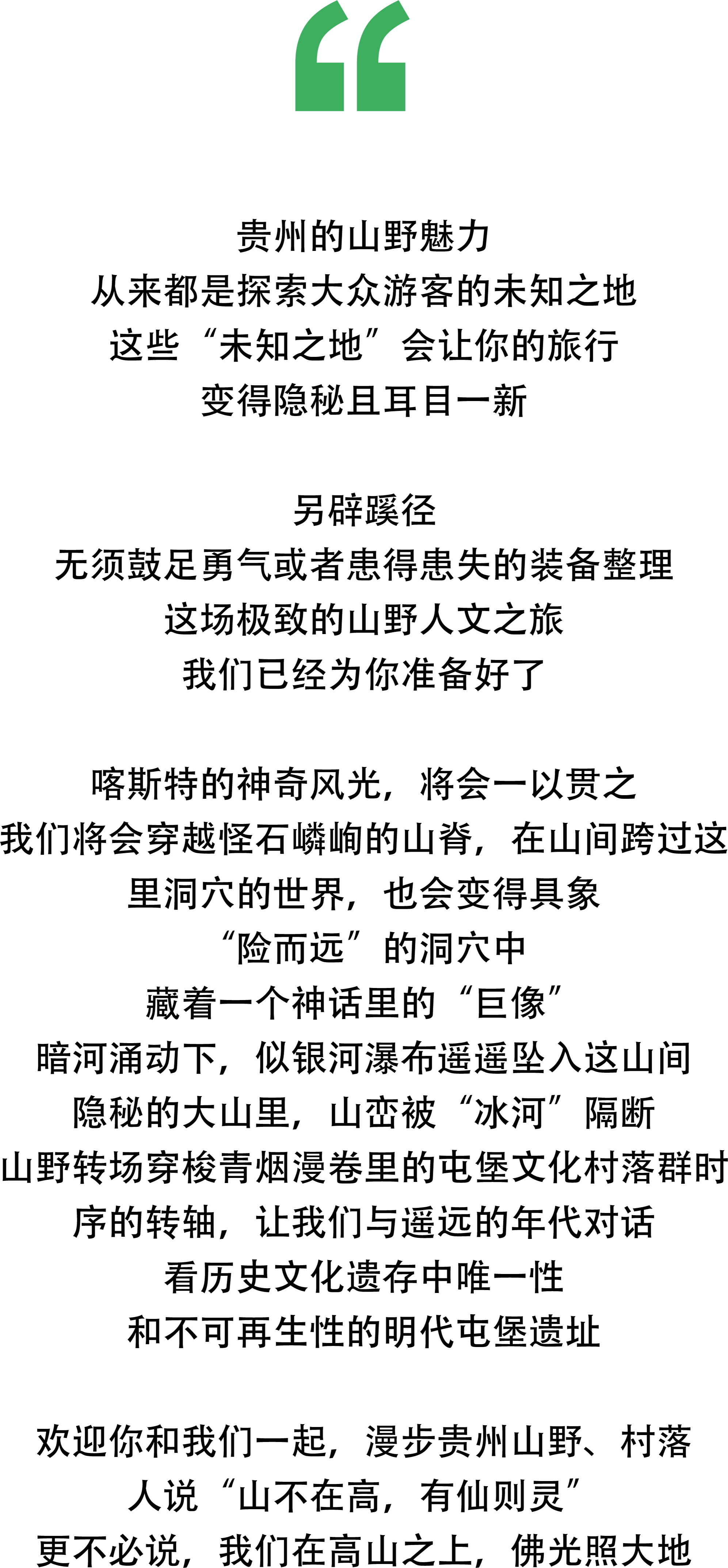贵州,一个俊秀而灵动的山地城市,像荒野里的风,藏着野性的呼唤。鲜为人知的山水间,总是少不了动人心魄的秘境。以城市之名邀你赴一场山野之约,漫长岁月里,沧海退去的高原隆起。