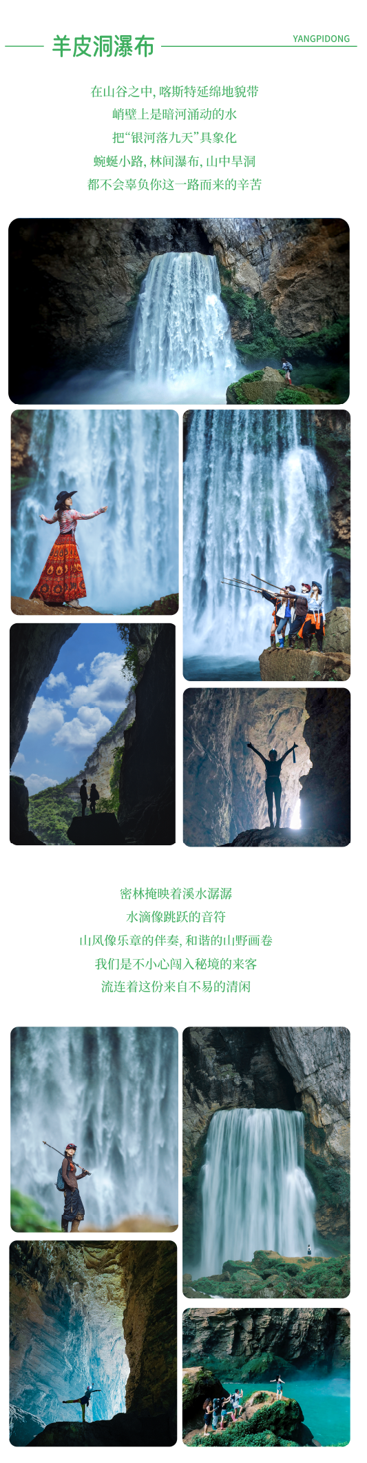 早餐后乘车前往旅程的首个秘境——羊皮洞瀑布,热身后徒步下至峡谷底部,欣赏“网红瀑布”羊皮洞,在瀑布前打卡拍照,中午在坝子上分享各自带来的美食午餐。下午探访神秘洞穴,后徒步环线回到停车点,乘车返回贵阳市区,入住酒店。