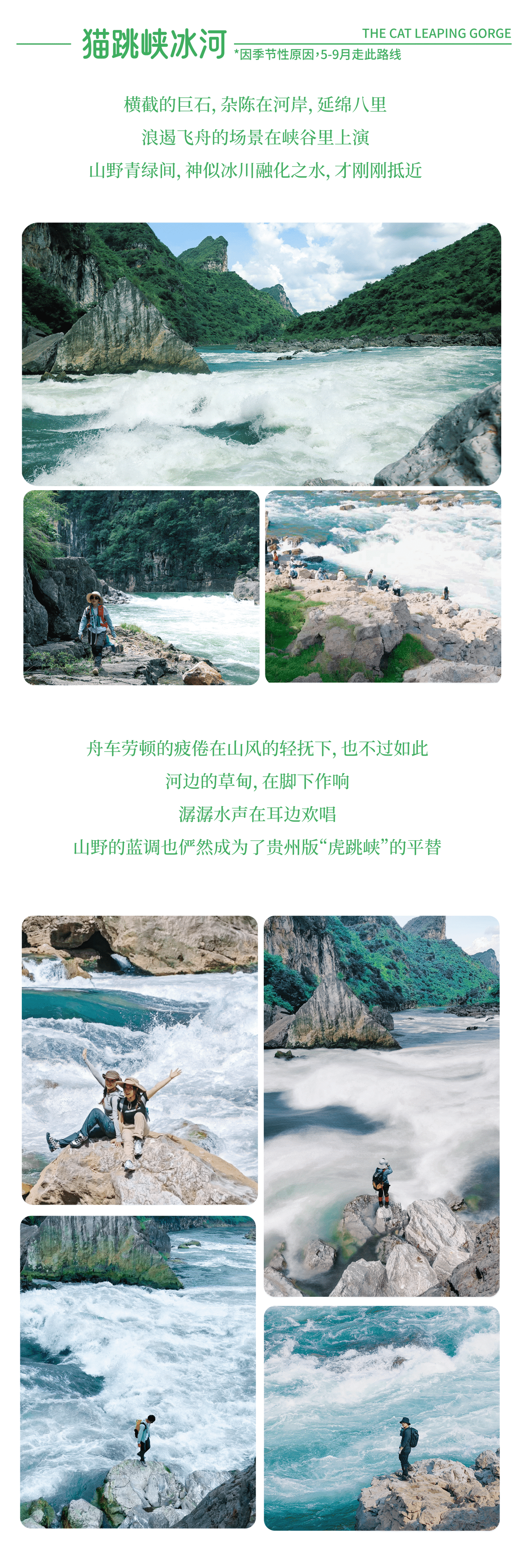 早餐后前往猫跳峡冰河,沿路穿过村庄,沿着河岸徒步,两岸高山耸立,鸟语花香,最后到达河道最窄处,看河水激流而下,壮阔无比。游毕后乘车返回安顺酒店