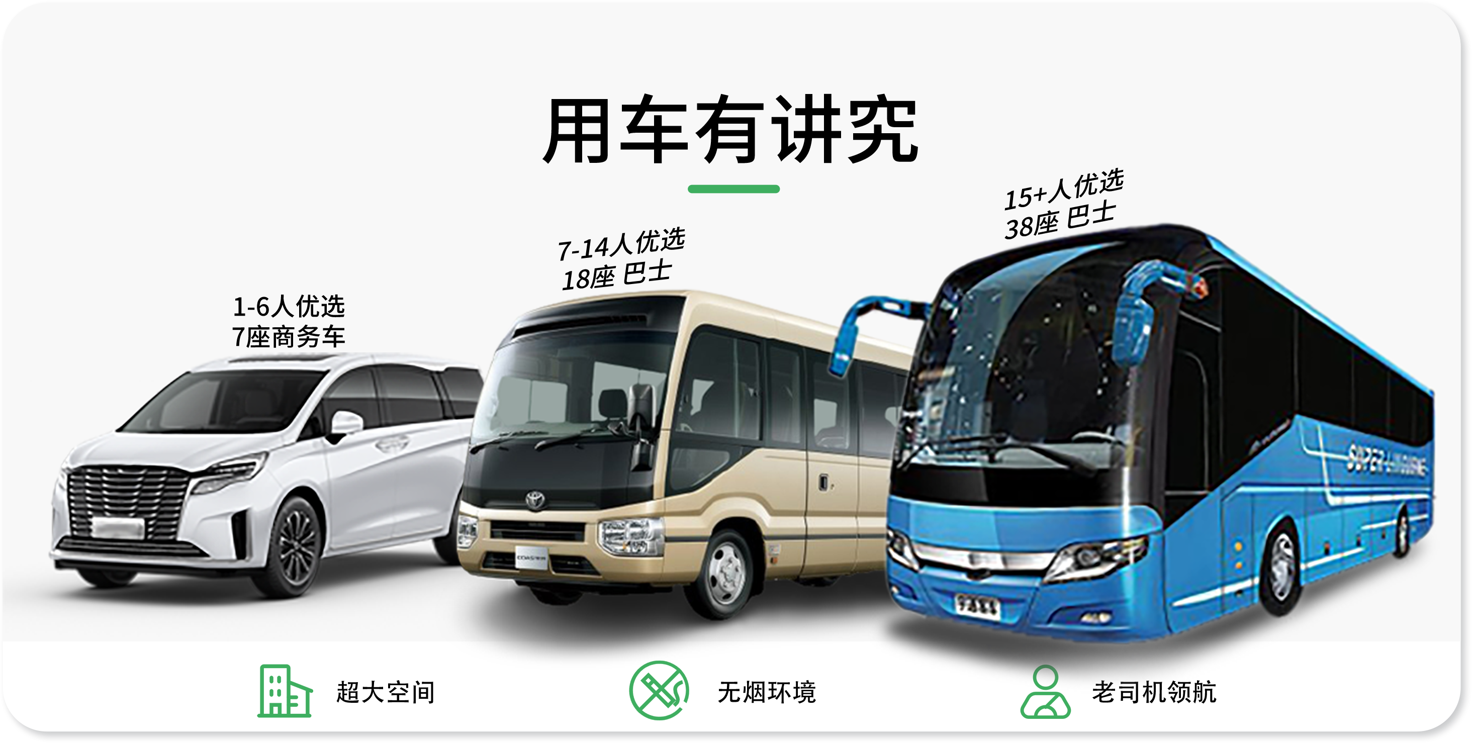 ➀ 用车:当地行程用车(根据具体人数选配车型:5-38座)