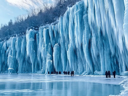 视线延伸,洞顶垂下的无数冰笋与冰柱密集如林,构成一片静谧而壮观的冰柱森林,在光影交织下流光溢彩。而沿洞壁倾泻而下的巨型冰挂帘幕,如瞬间冻结的瀑布,晶莹剔透,泛着幽蓝光泽,成为绝佳的震撼背景。