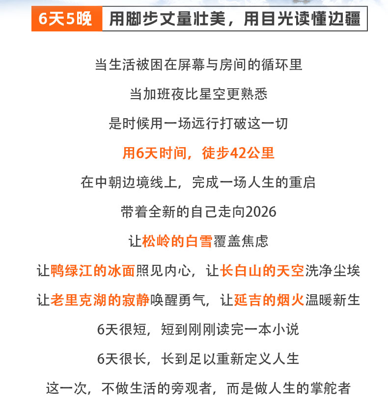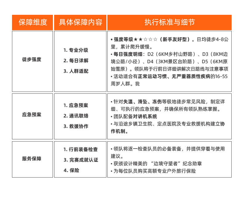 服从领队安排,勿擅自离队行动;徒步时注意防滑,遵守边境区域规定(如禁止拍摄、越界等)。