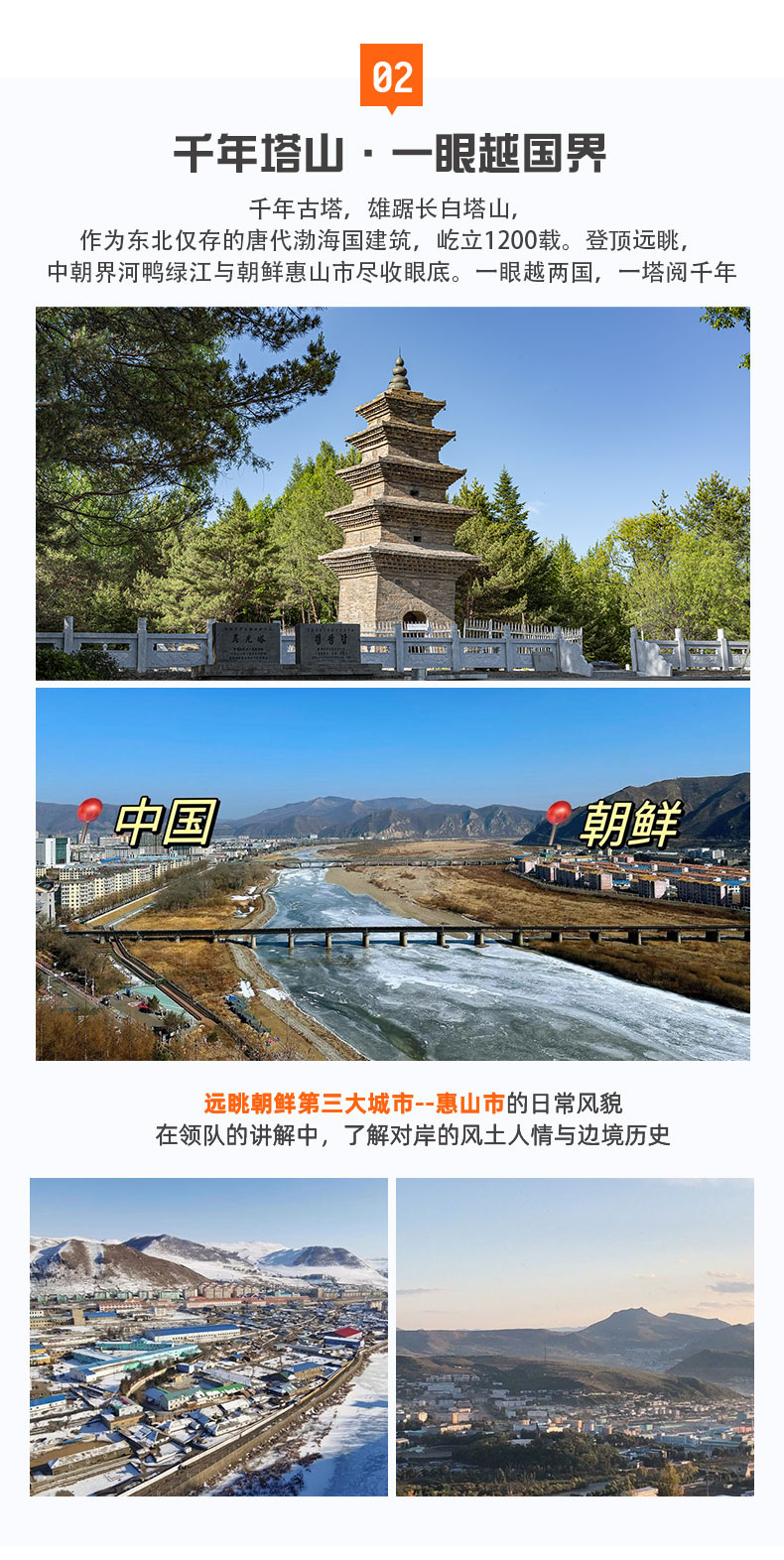 午后抵达【长白县】,我们将用脚步丈量县城西北部【塔山公园】。公园始建于1988年,占地面积约50公顷,是东北最高的公园。园内的灵光塔始建于渤海国时期,是东北唯一的唐代渤海国古塔,斑驳的砖石诉说着千年的历史。登顶塔山,不仅可以近距离感受这座古塔的沧桑,更是俯瞰整个长白县全景及对岸朝鲜惠山市的绝佳位置。