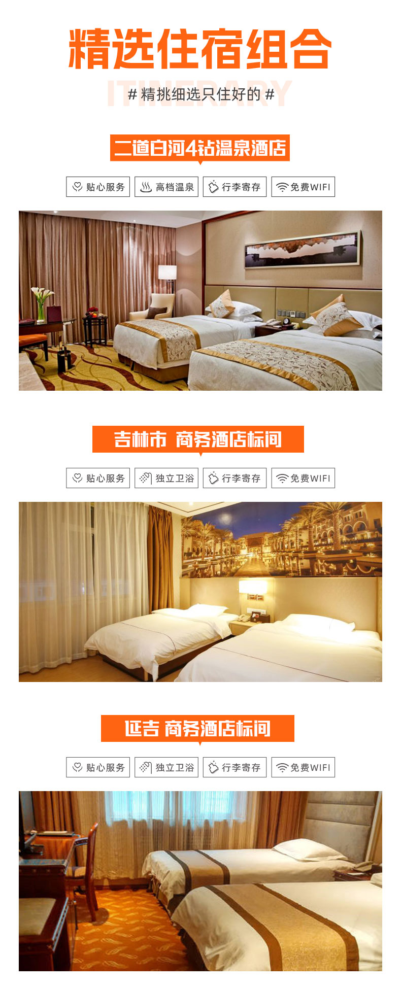 长白山景区由于冬季旅游人数较多、景区限流、提前15天预约等因素,团队参观时间严格执行预约时间游览,景点参观顺序按照预约时间进行调整,如未能预约到长白山景区门票或当天临时闭园,我司将调整徒步穿越“长白山原始森林5KM”(门票及车程相抵扣无差价退还)