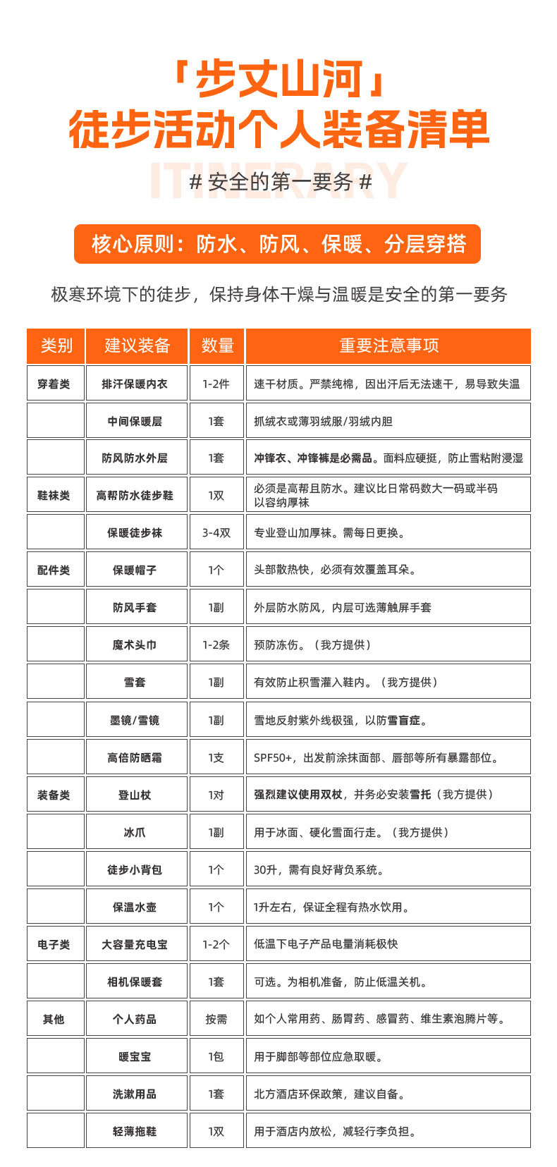 本行程涉及中等强度徒步(单日最长8km),高血压、心脏病患者及行动不便者请勿报名。