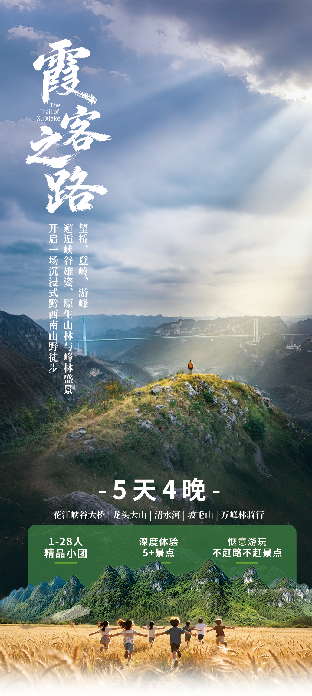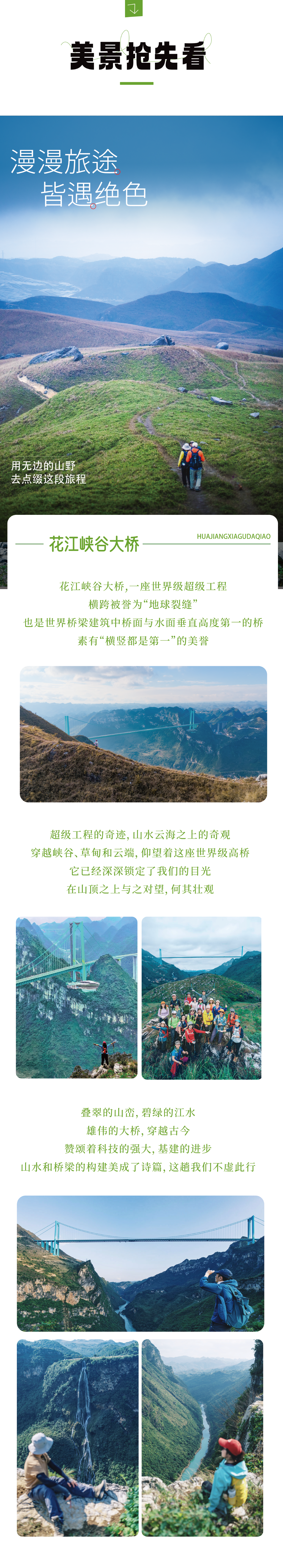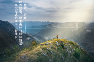 早餐后乘车前往【花江大桥】,这里是北盘江峡谷的视觉焦点。热身起步,徒步穿越村落、田园、山谷与山脊,多角度欣赏大桥雄姿与峡谷瀑布。中午在视野开阔的山头共享户外午餐(请自备干粮分享)。