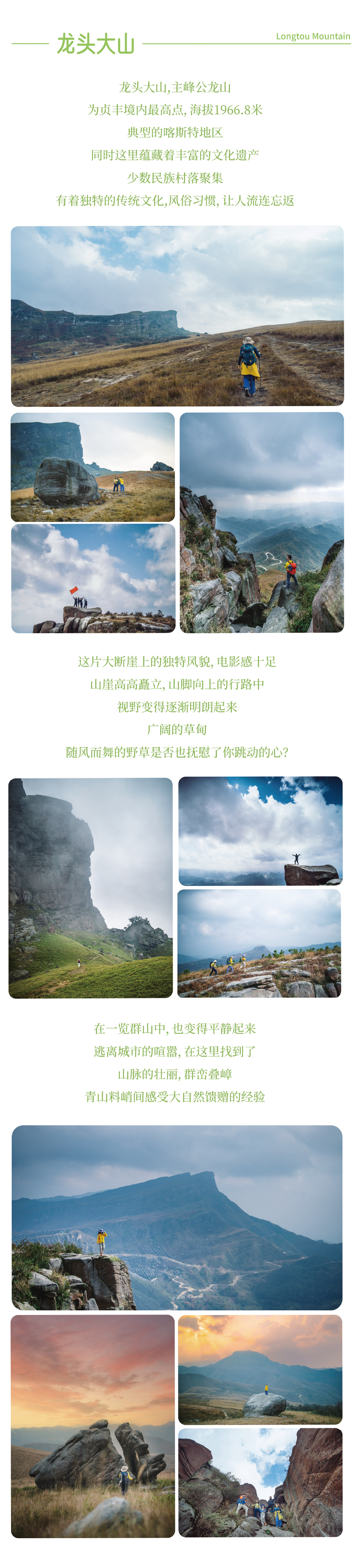 下午沿山脊行走,在草甸上尽情舒展,打卡不同角度的峰峦景致,最终登顶龙头大山。随后在美景陪伴下撤至终点,乘车前往兴义市区入住。晚上可自由组合用餐,感受小城夜话。