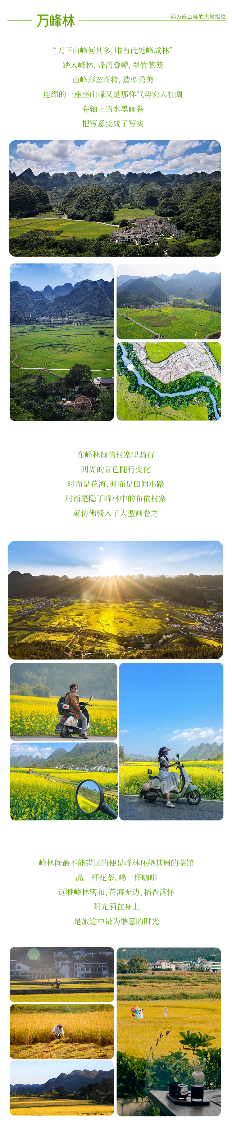 万峰林骑行体验,含两轮电动车使用:成人每人 1 台电动车;未成年人不单独提供电动车,须与家长共乘 1 台。