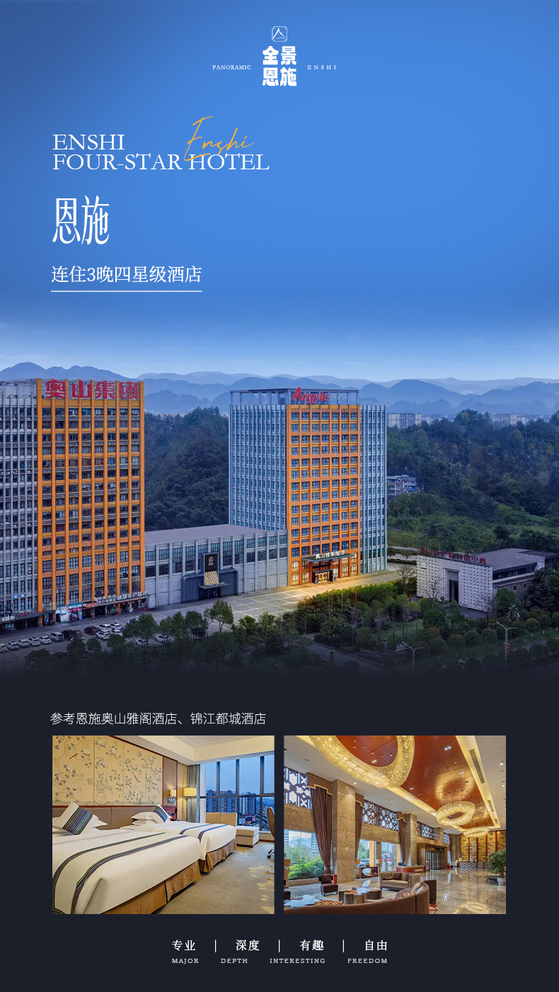 2、住宿:3晚恩施四钻酒店(参考奥山雅阁酒店、住景国际酒店、锦江都城酒店)、1晚宣恩准四酒店(参考维也纳酒店、亚悦酒店、金源国际酒店等);