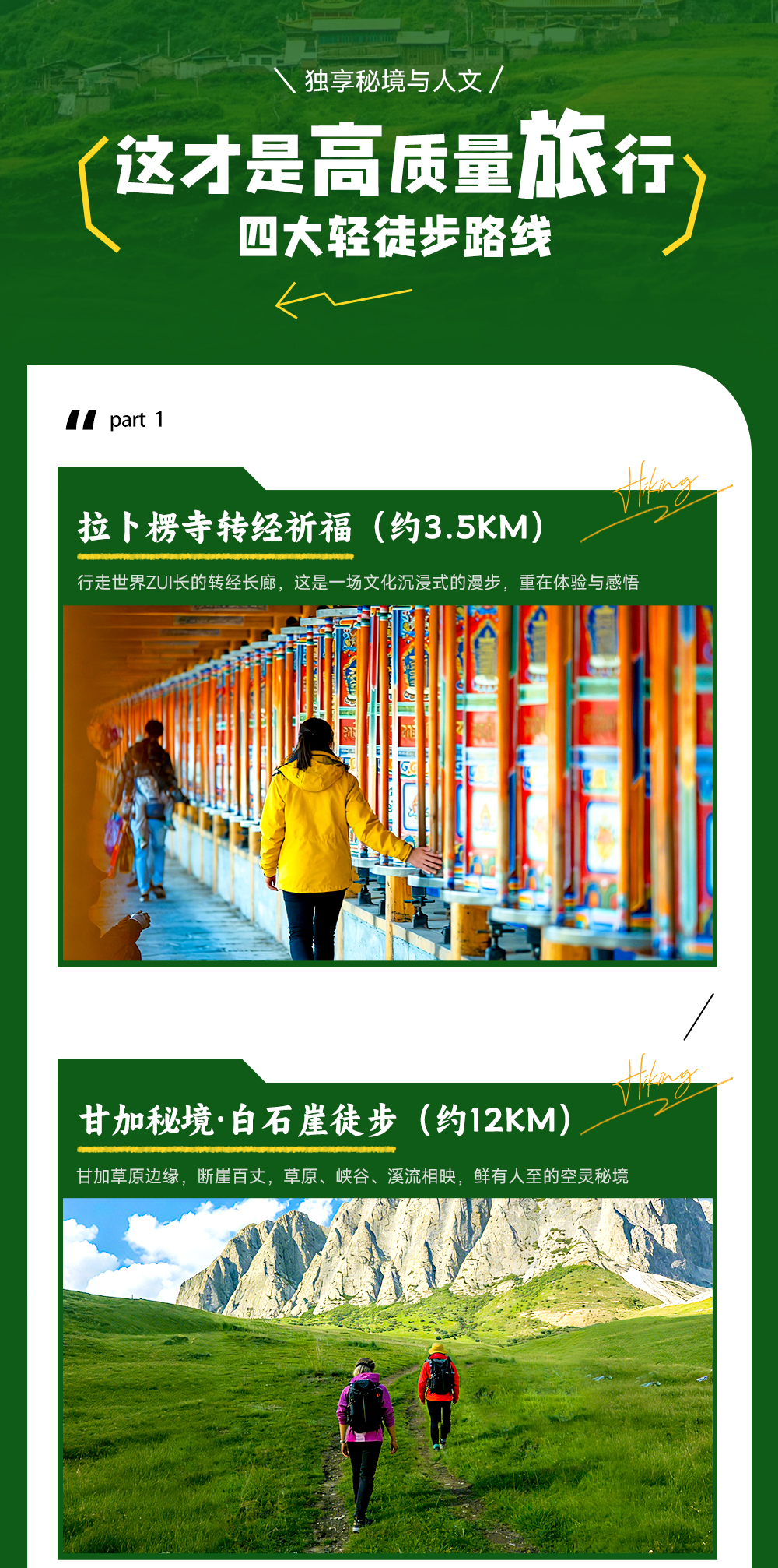 而徒步的尾声,会在仙女滩邂逅极致的人文与自然交融之景。站在开阔的林间草甸上,360 度全景将扎尕那四村一寺尽收眼底,东哇村的藏式木屋依山而建,炊烟袅袅;拉桑寺的金顶在阳光下熠熠生辉,梵音隐约可闻,高原村落的质朴与宗教圣地的庄严在此完美融合,为整段徒步画上圆满且震撼的句点。