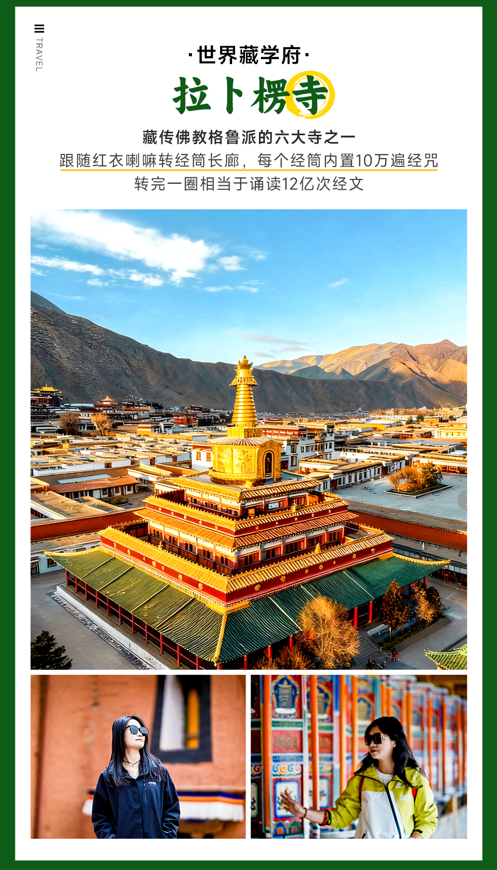 早餐后我们乘车出发前往甘南第一站:夏河拉卜楞寺(车程约3H,225公里)【拉卜楞寺】是藏传佛教格鲁派六大寺院之一,被誉为 “世界藏学府”。拉卜楞寺由第一世嘉木样协贝多吉大师于 1709 年主持始建,经历代嘉木样大师和各大活佛的不断扩建和完善,规模逐渐宏大。寺院坐北向南,占地总面积 86.6 万平方米,建筑面积 40 余万平方米,主要殿宇 90 多座,包括六大学院、16 处佛殿、18 处昂欠(大活佛宫邸)、僧舍及讲经坛、法苑、印经院、佛塔等。
